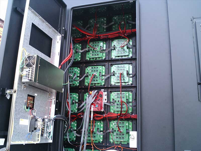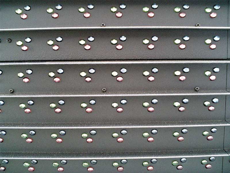 近くに寄って素子を見てみると赤・緑・青の三色のLEDが均一に並んでいるのが分かります。光の三原色であるこの3つのLEDで一つの色を表現します。25mmの間隔で並んでいるので25mmピッチLEDというそうです。この高輝度青色発光ダイオードに関する中村・赤崎両教授の研究がなければ綺麗なLEDディスプレイの発色は無かったんですねぇ。
