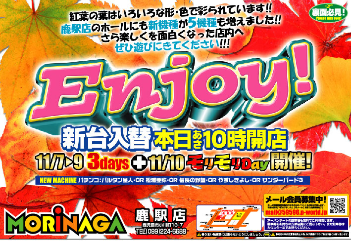 日頃のご愛顧に感謝いたしまして、明日11/7の新台入替を皮切りに今月11月いっぱいは、ず~~~~っと全機全台全力投球!