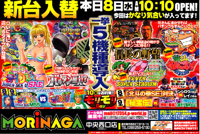 そして11/8はMORiNAGA中央西口店も一挙に5機種導入しての新台入替です。