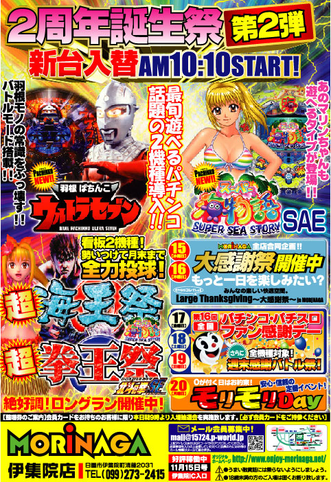 今回は遊べるパチンコ、テレビCMでおなじみ「羽根パチンコウルトラセブン」とみんな大好き「スーパー海物語」の遊べるタイプ「SAE」の導入です。加えてMORiNAGA全店舗で開催中の「大感謝祭」も見逃せない。