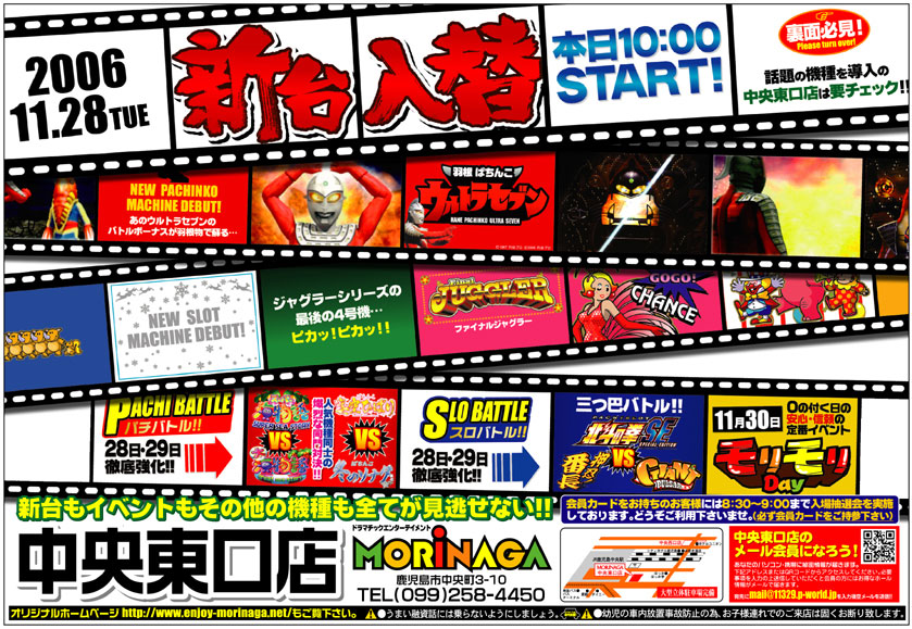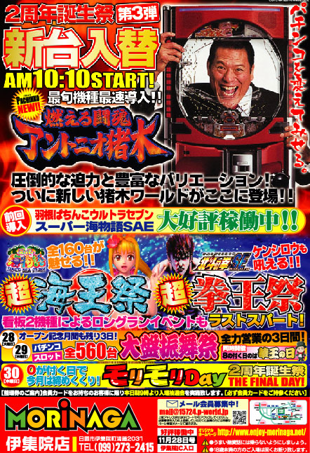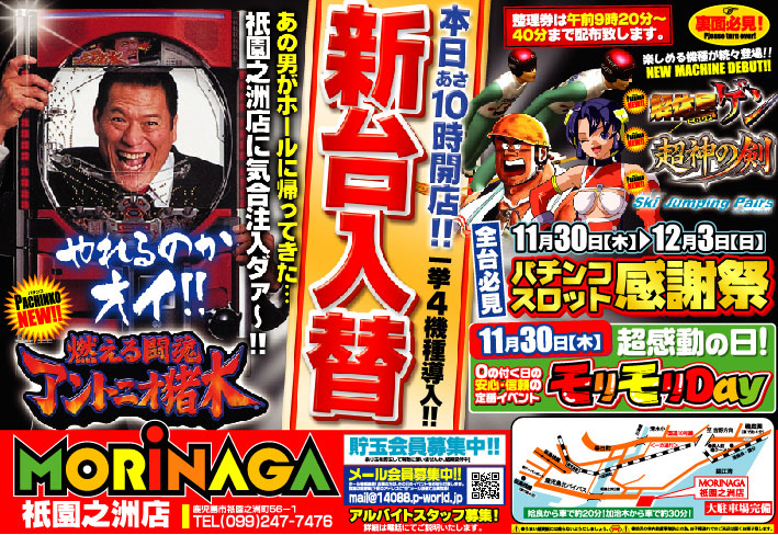 明日、11月28日、MORiNAGAは中央東口店・祇園之洲店・騎射場店・伊集院店・ヒートスロットの5店舗同時新台入替です。